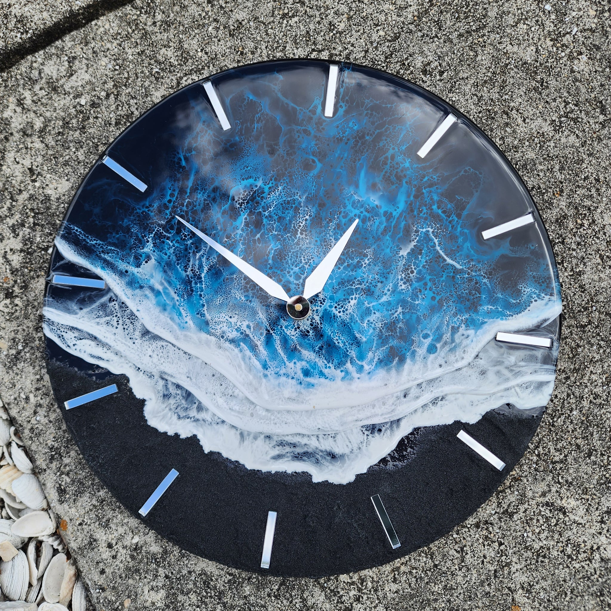 Black & Blue Wave Clock with silver acrylic accents. Made with real local sand, shells, and epoxy waves.
