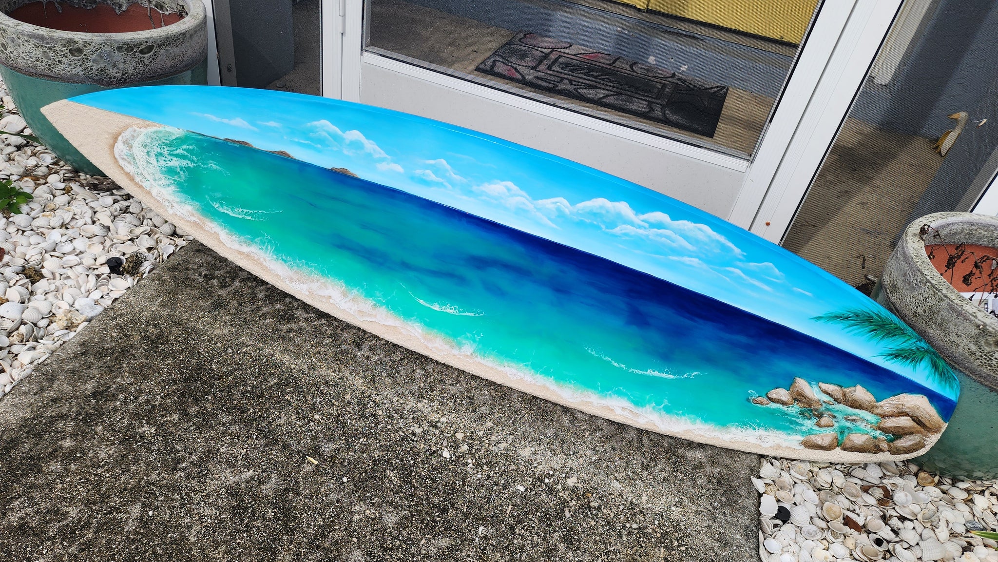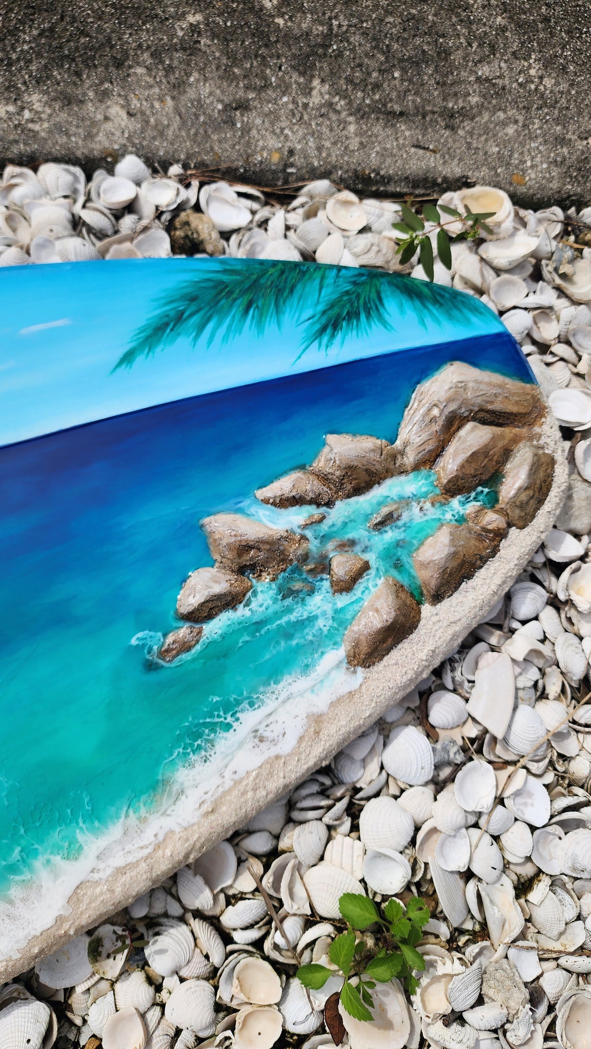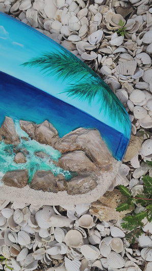 This surfboard is a true statement piece. Made from real sand, shells, sculpted rocks, painted details and epoxy resin on 1/2 inch MDF.