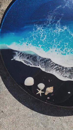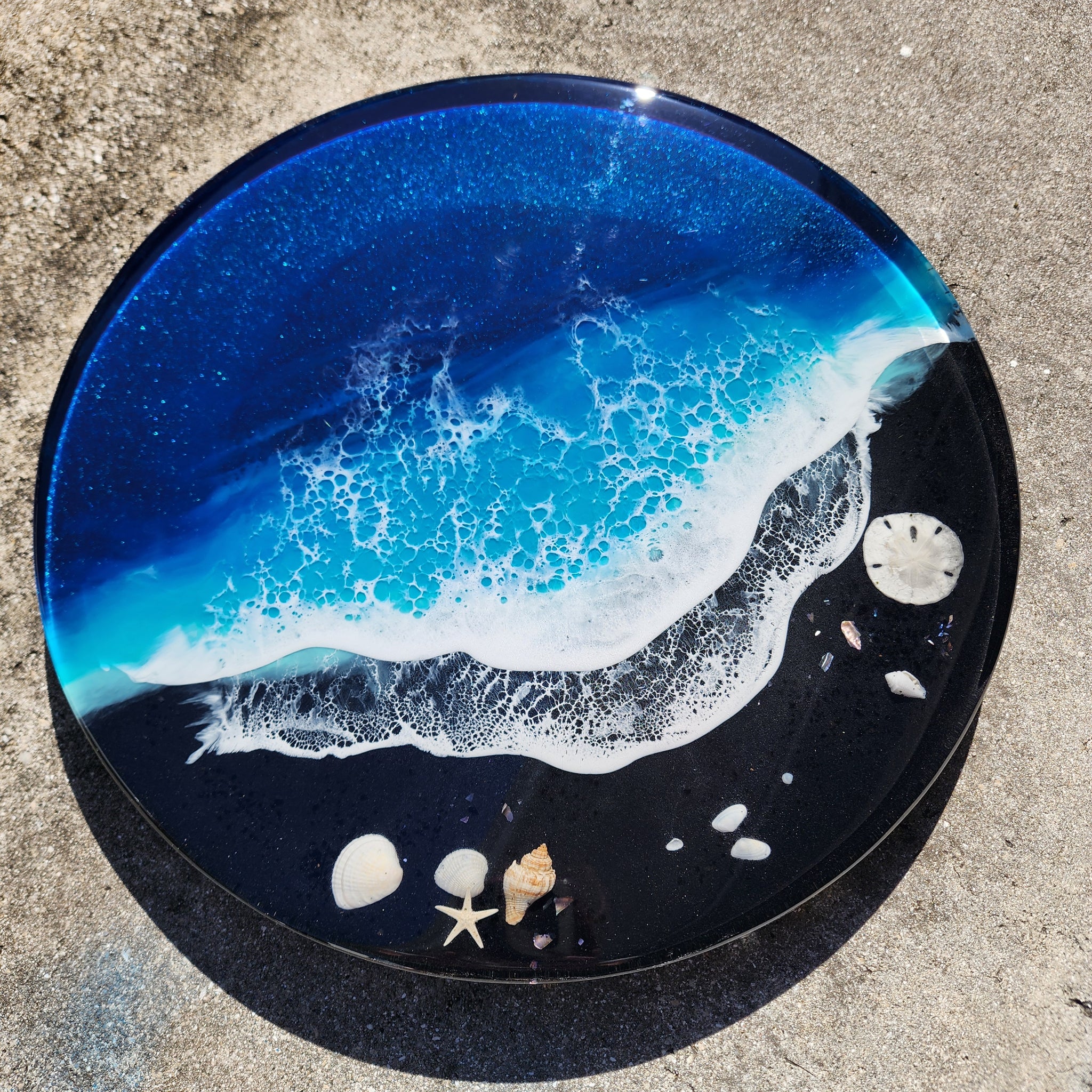 This lazy susan is sure to turn heads! Made from real sand, shells, sand dollars, starfish and epoxy, this is a truly stunning table centerpiece. The surface is fully level, perfect for functionality. Don't miss out on this one of a kind piece!