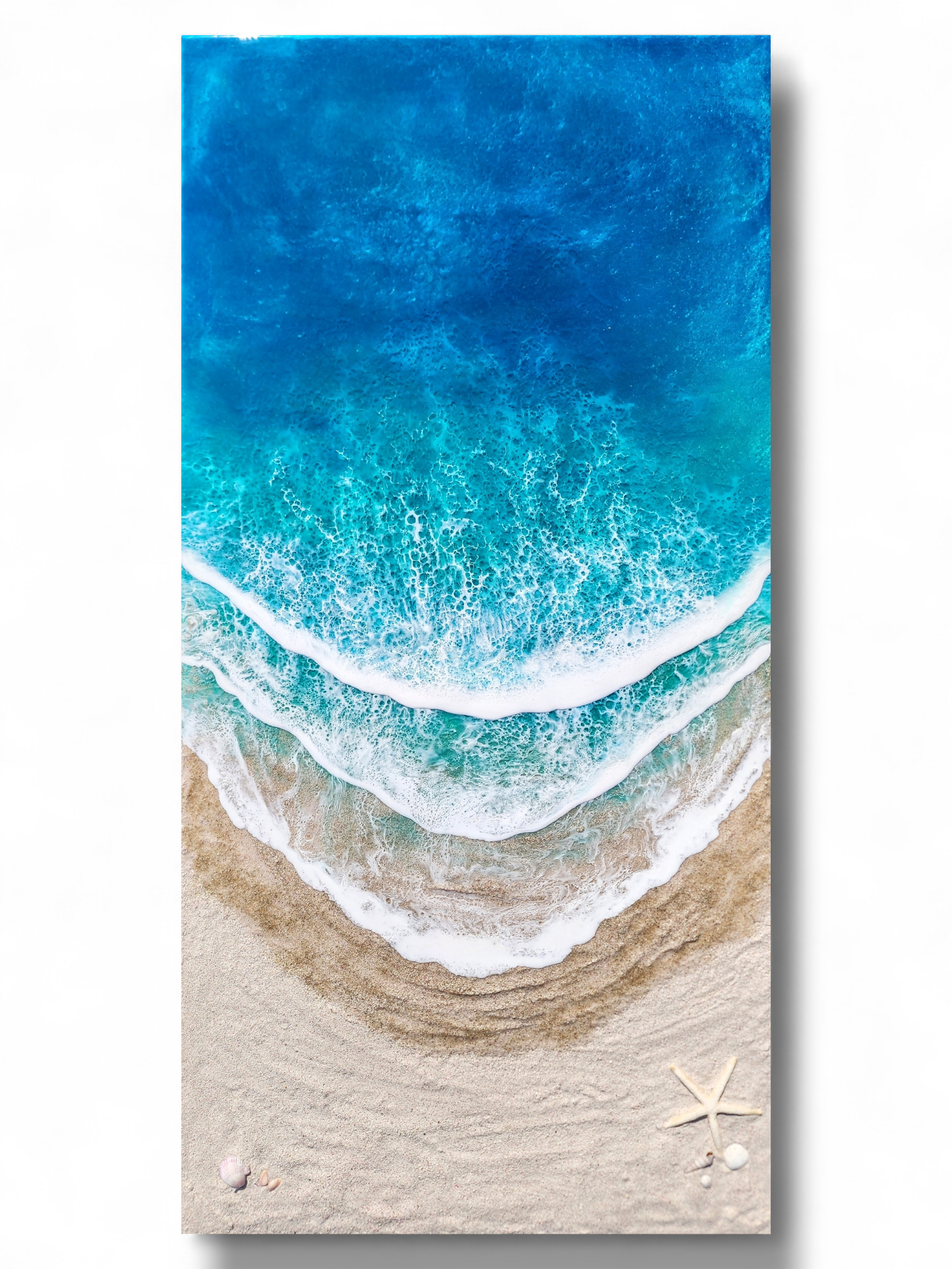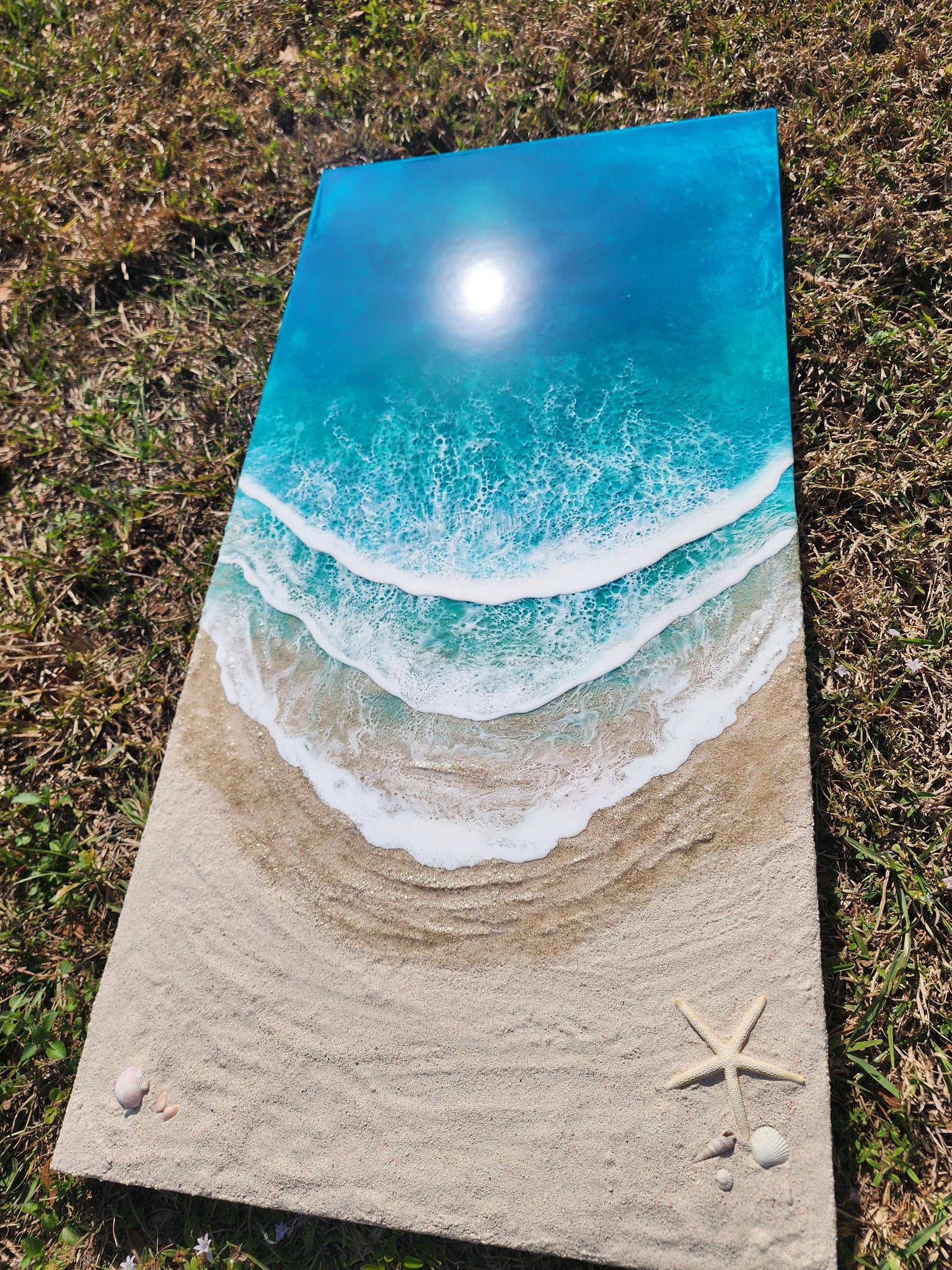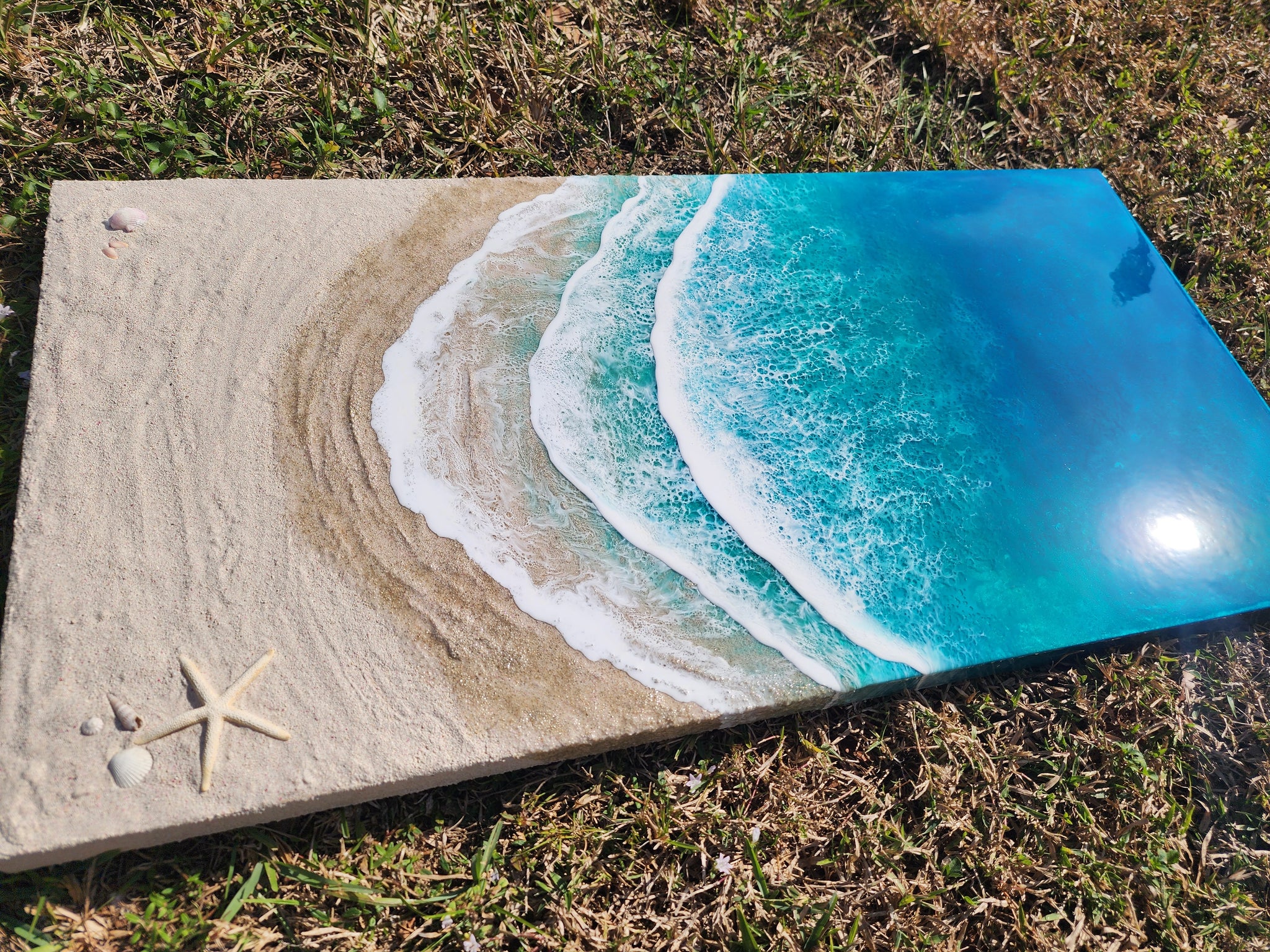 Hang the beach on your wall! This beautiful wall piece contains real beach sand, shells, starfish and layers of epoxy waves. This slice of the beach will be a conversation starter in your home.