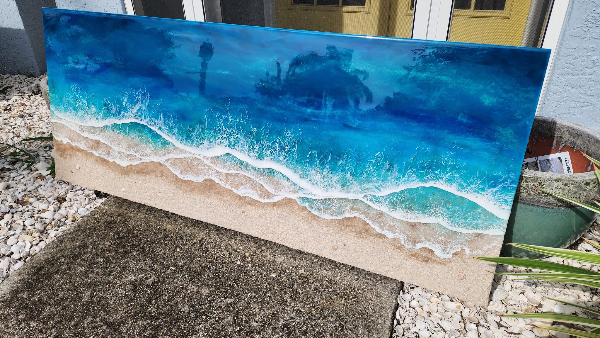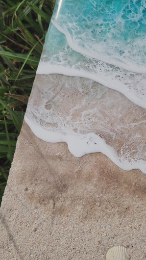 Tranquility is a mixed media painting made from real local sand, shells and 4 layers of epoxy waves on a birch wood panel.