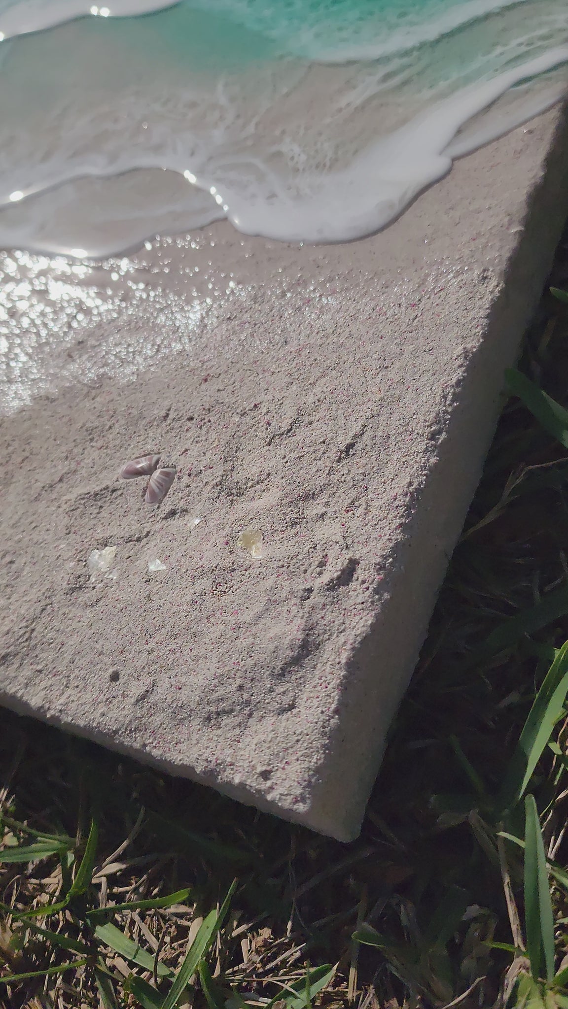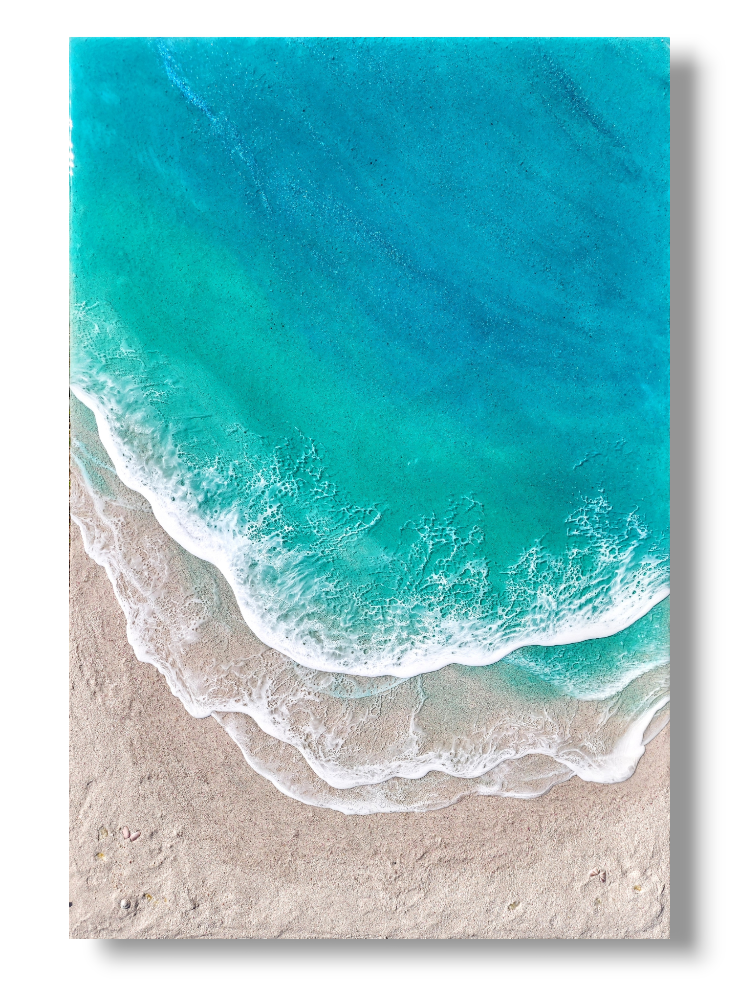 Mixed media: epoxy waves, real sand & shells on a birch wood panel.