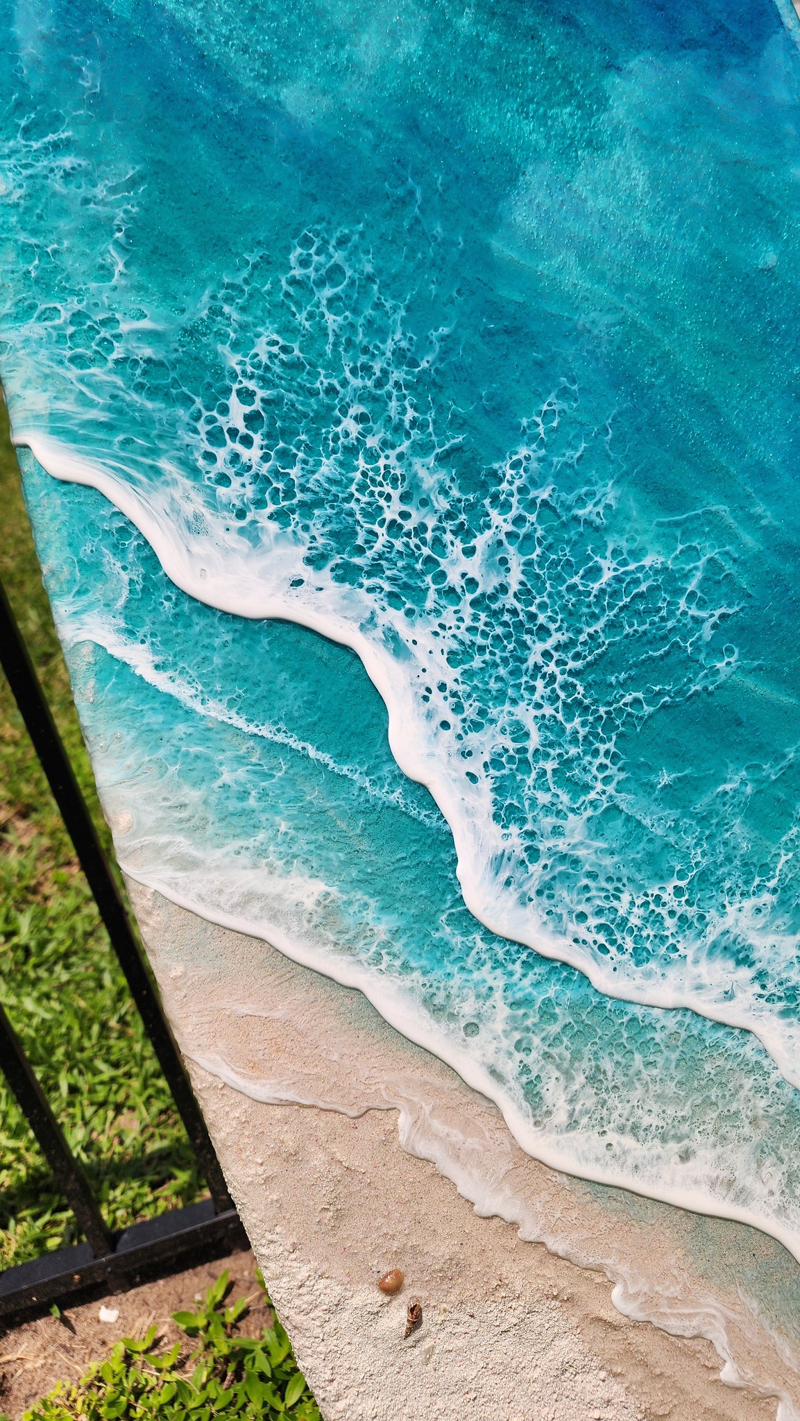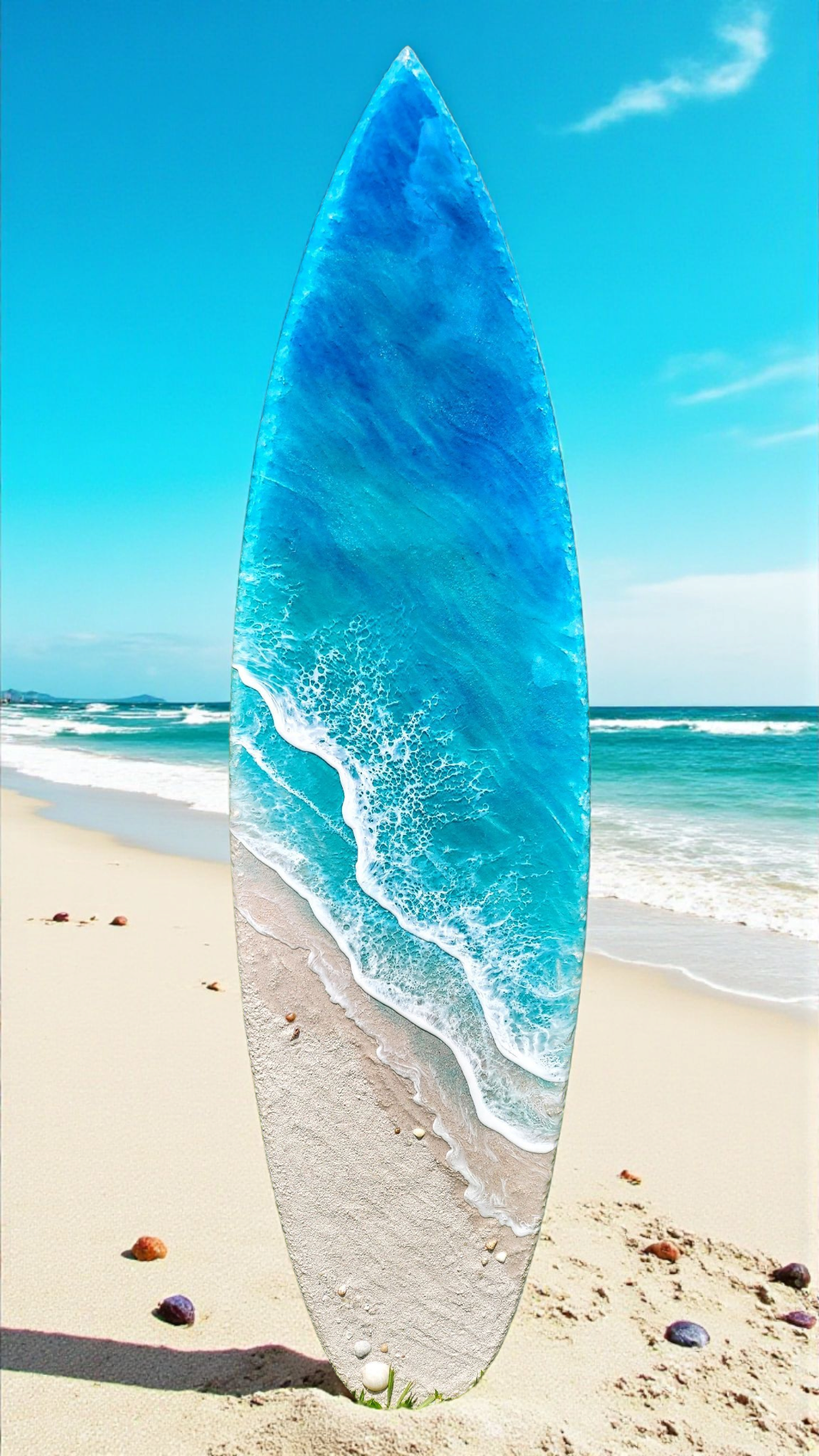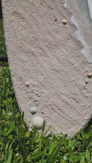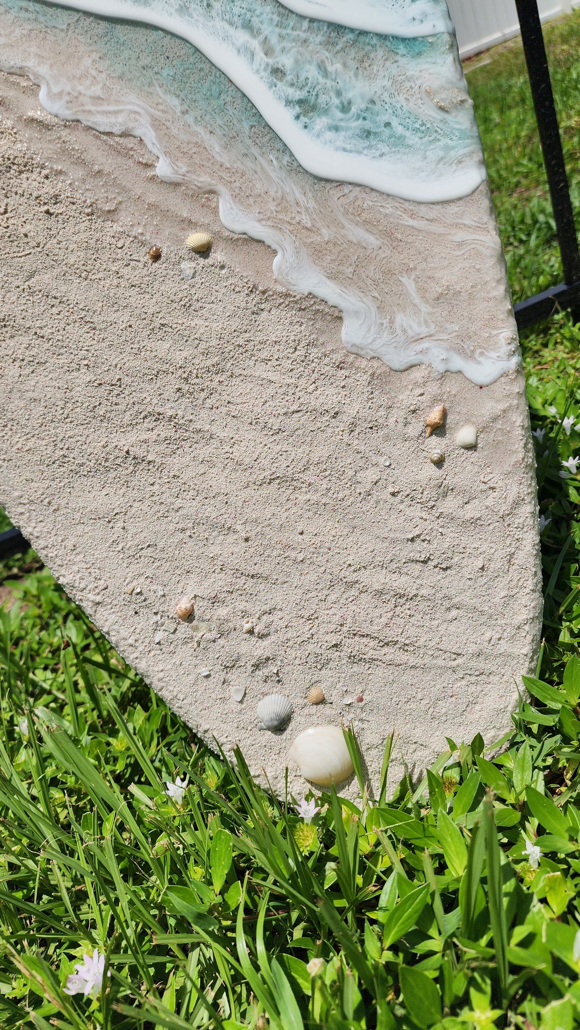 This 5ft Beach Wave Surfboard would make the perfect wall art for your home. This piece features real sand sculpted throughout, translucent epoxy waves and real shells. It can hang either vertically or horizontally.