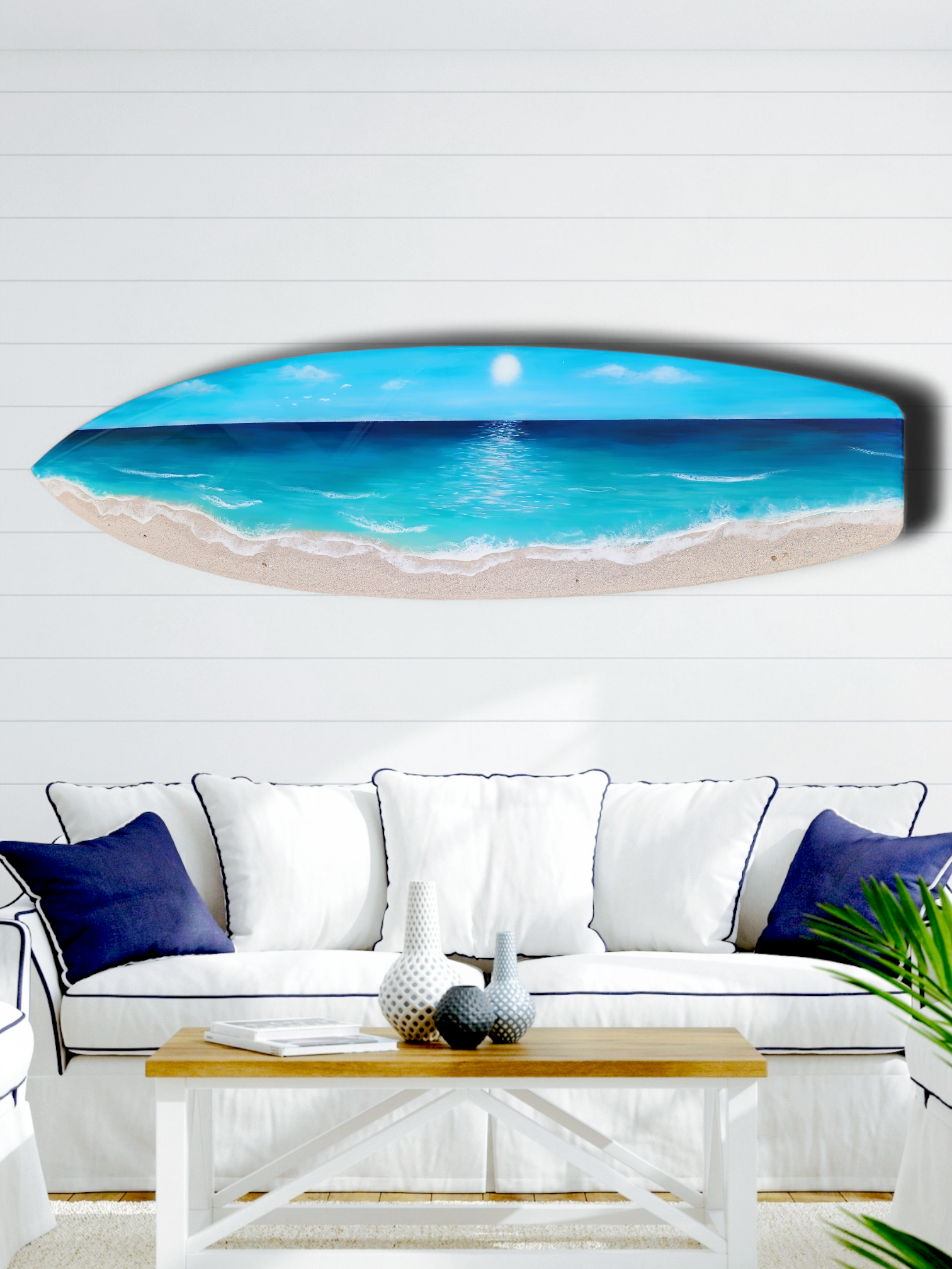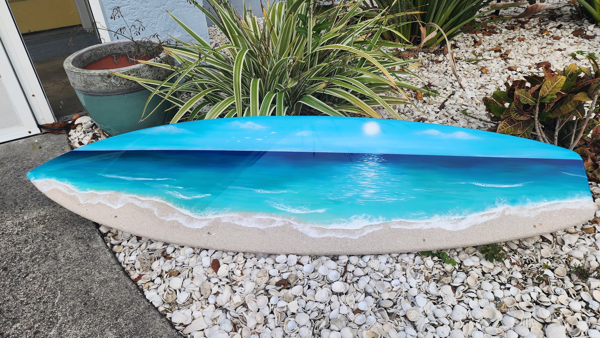 This surfboard is a true statement piece. Made from real sand, shells and epoxy resin on 1/2 inch pine.