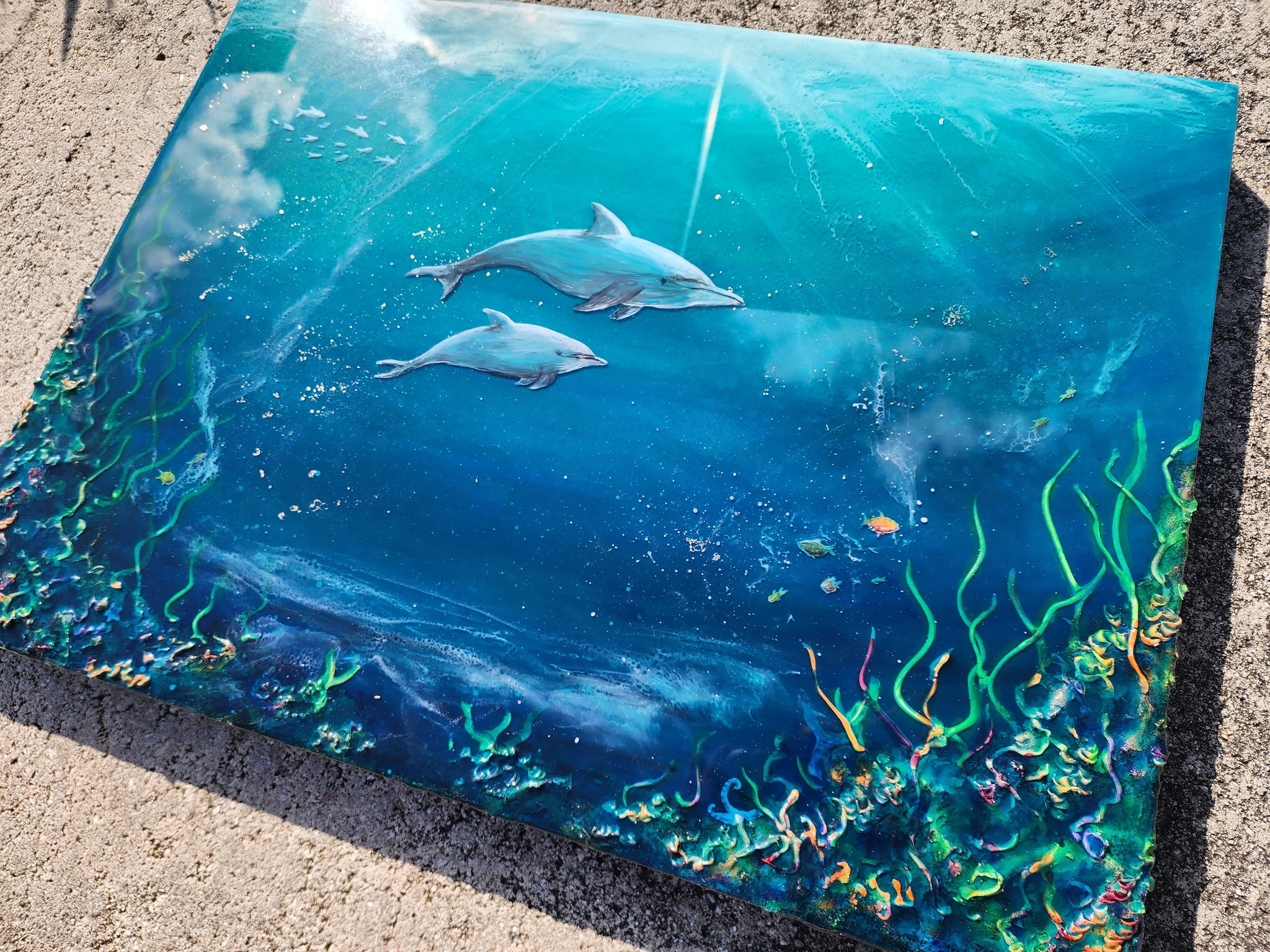 Mixed Media, sculpted accents, layers of epoxy and acrylic painted dolphins.