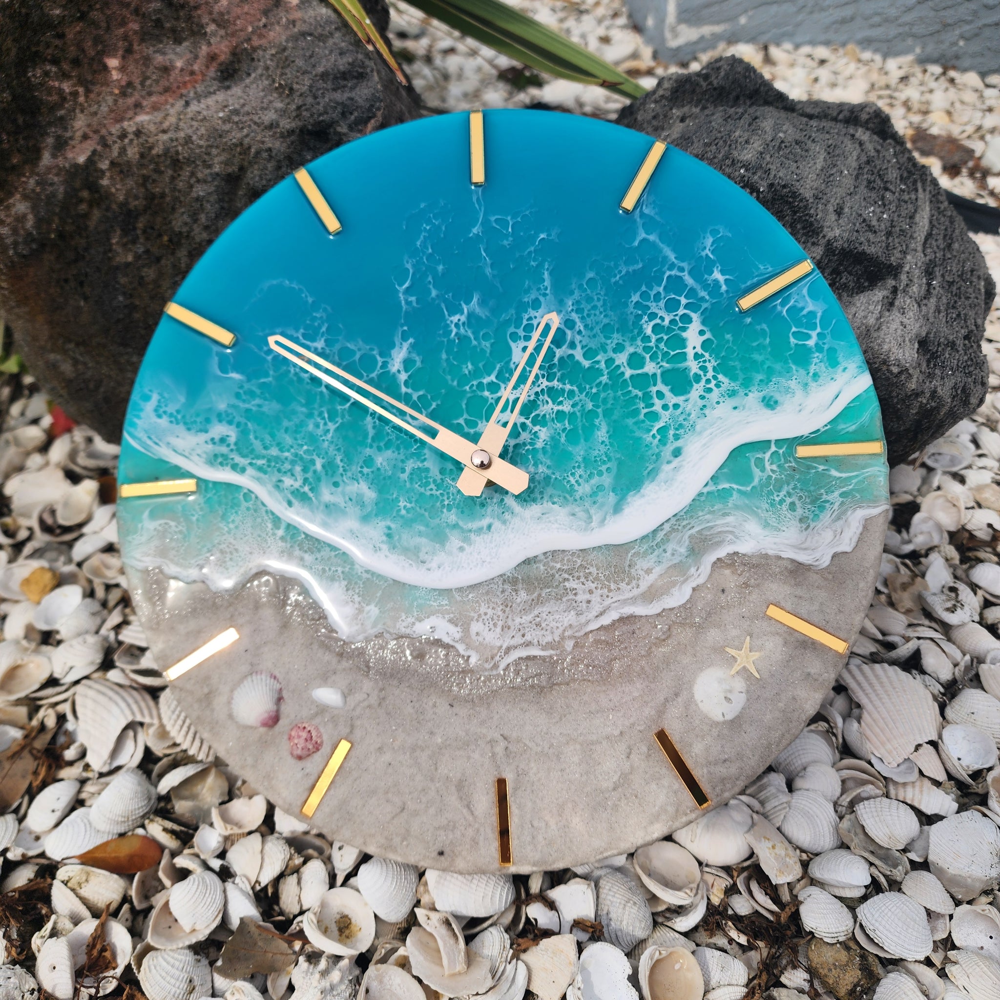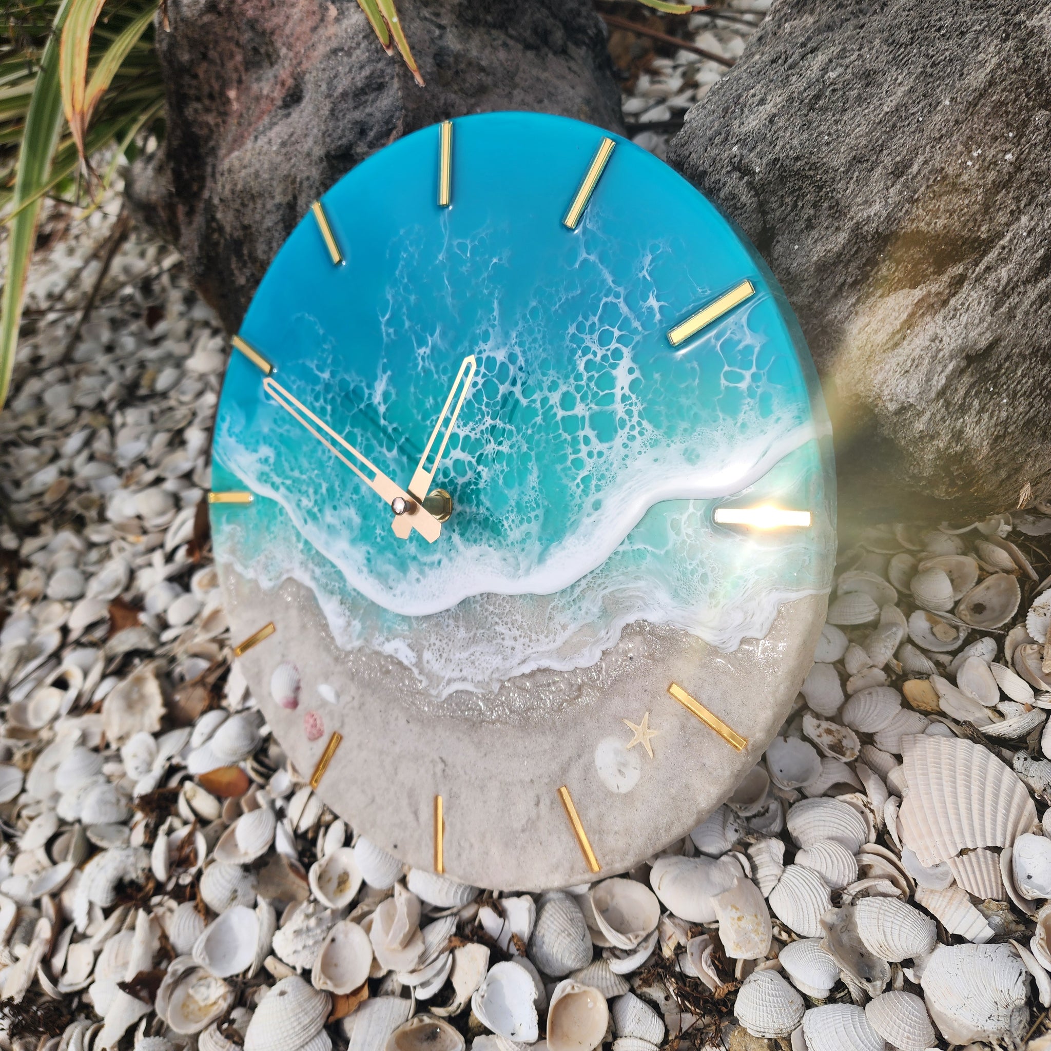 Tropical Wave Clock with gold mirrored acrylic accents. Made with real local sand, shells, and epoxy waves.