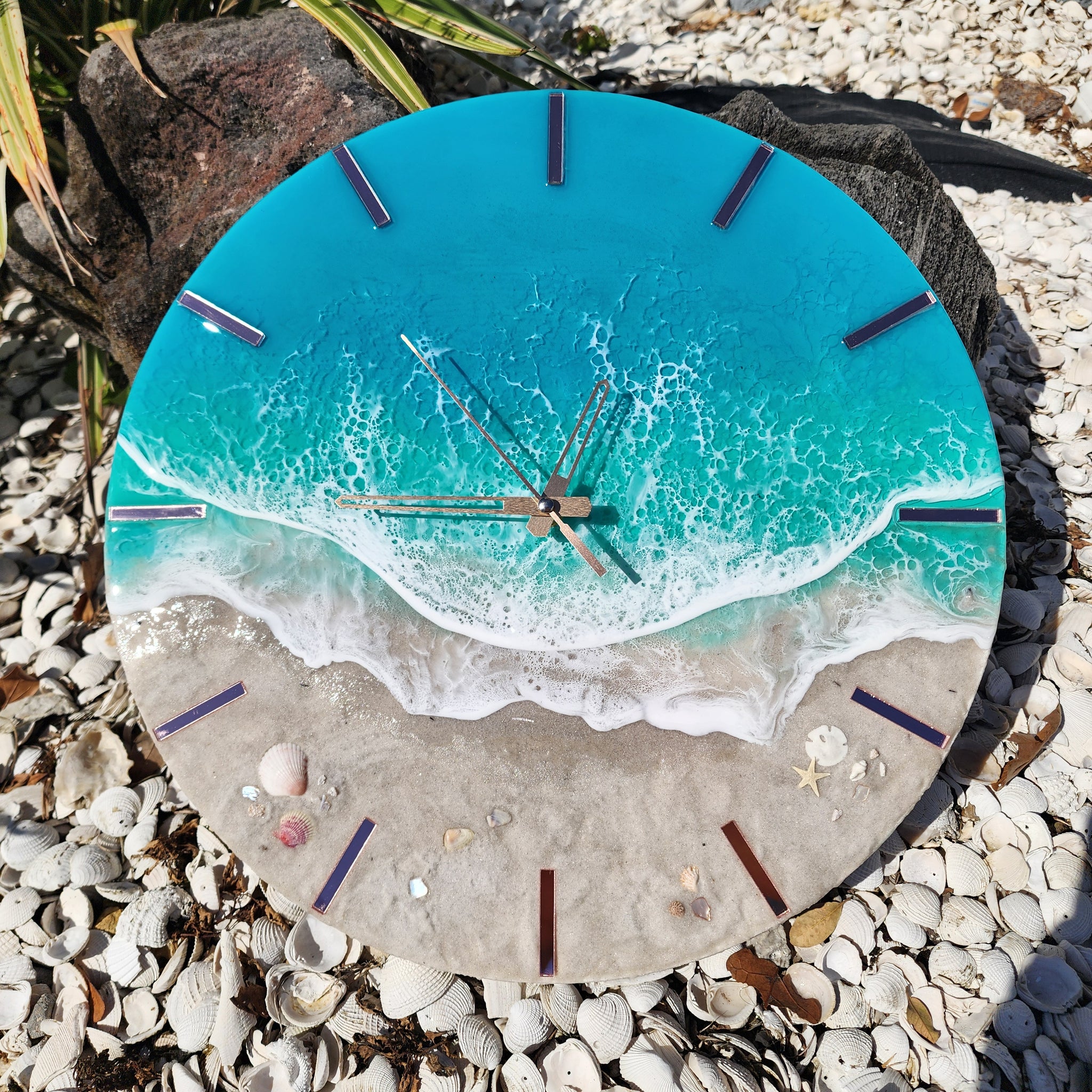 Tropical Wave Clock with rose gold/pink mirrored acrylic accents. Made with real local sand, shells, and epoxy waves.