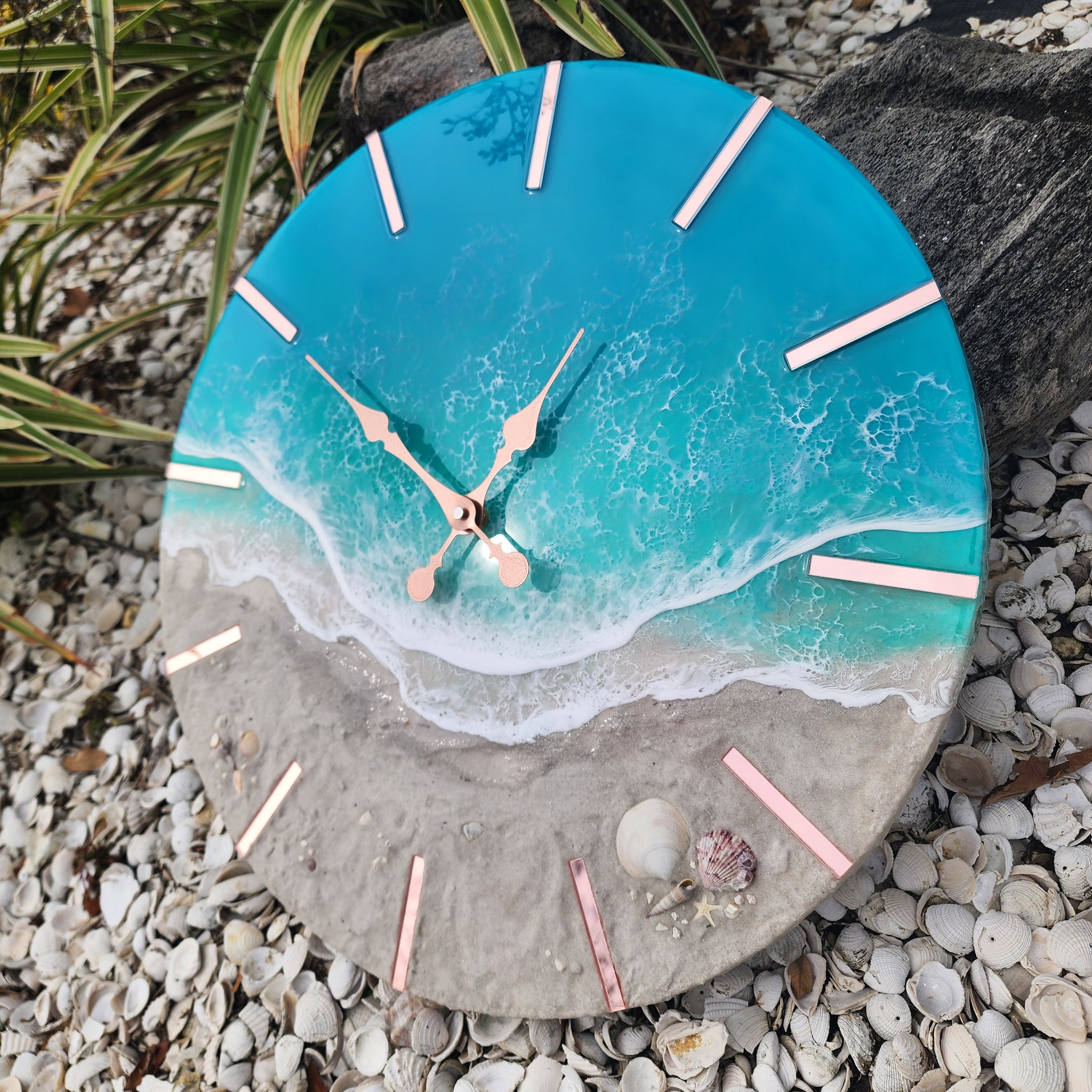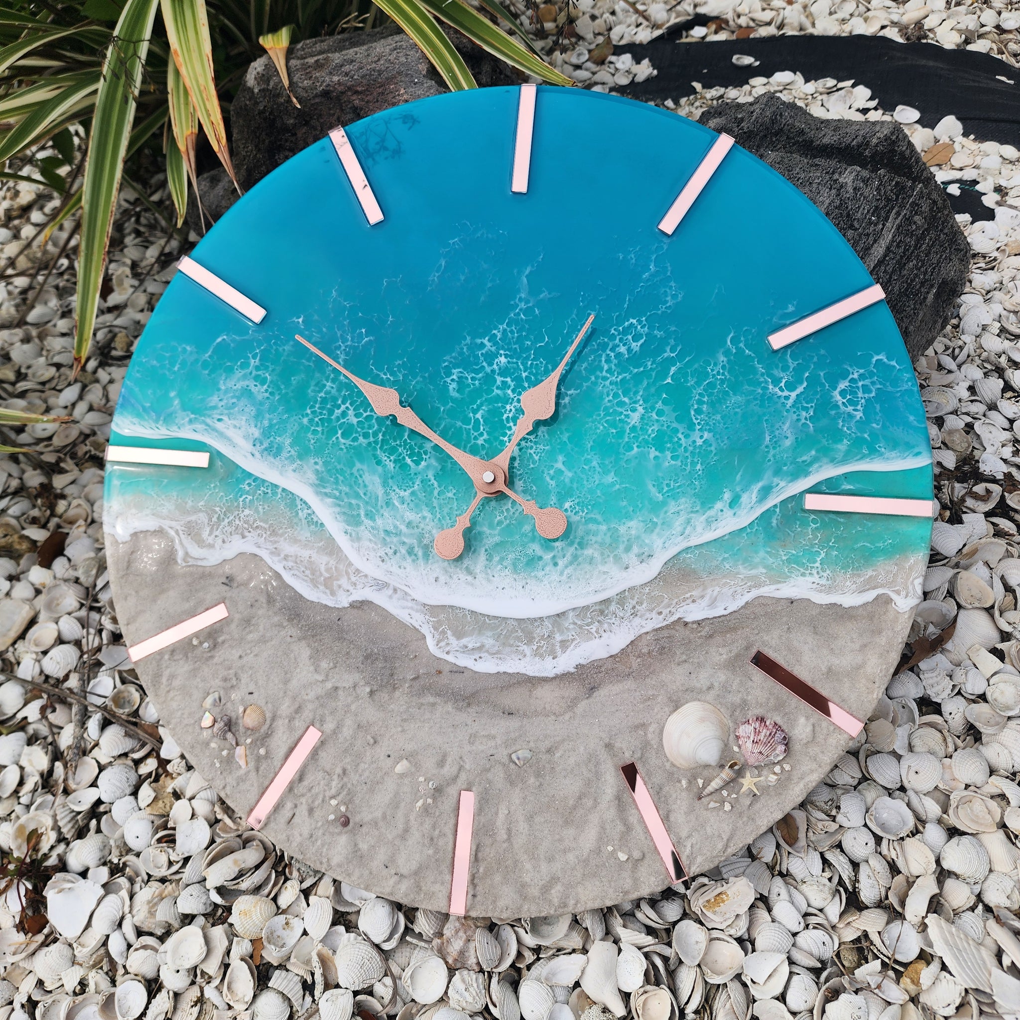 Tropical Wave Clock with black acrylic accents. Made with real local sand, shells, and epoxy waves.